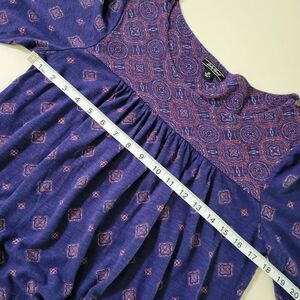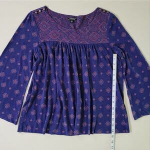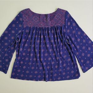 Boho style top by Lucky Brand has mixed prints and bell sleeves. The shoulders are each accented with three goldtone buttons that are fastened with loops. Elastic at the yoke gives extra comfort to this fun top! Pair with your favourite denim for a perfect match. It's in great condition, too.