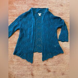 Open front cardigan, 33% wool, good condition, size is smaller than on the tag, S or M, cerulean blue color, on camera it looks different