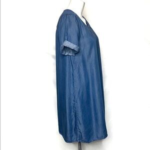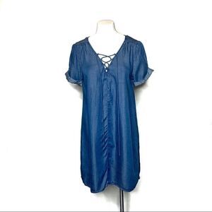 Lucky Brand short sleeve chambray lace up swing dress size S. V-neck with adjustable string. Rolled up sleeve cuffs. Good condition with one discolored spot (see pictures). 100% lyocell. Length 34”. Chest 18.5”.