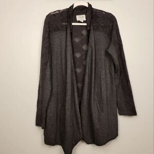 This beautiful open front cardigan has embroidered lace details on sleeves and back, edging details on pockets and hem.