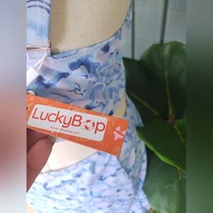 Luckybop Skirted Bikini Nwt Sz L Dreamy Clouds top has adjustable straps and padded cups bottoms have a nice flowy skirt over the attached bikini bottoms