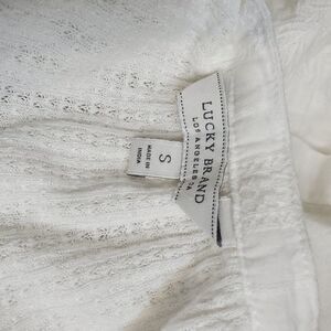 White v neck tunic style blouse with floral applique over net puff sleeve