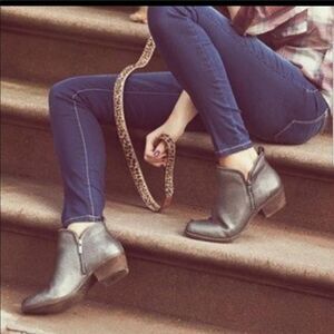 Chic shimmery pewter colored booties by lucky brand. Looks great with jeans but can also make a dress look a little edgier. Great condition with just a little wear to bottoms and couple scuffs on boot as shown but can’t see bcs of coloring. Heel height approx 1.5”