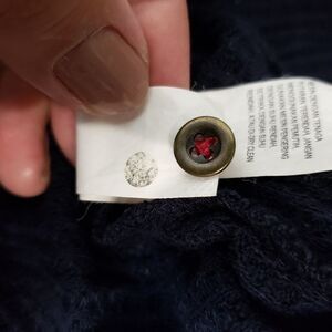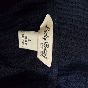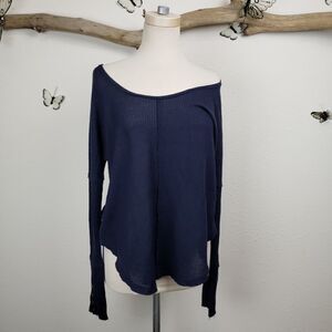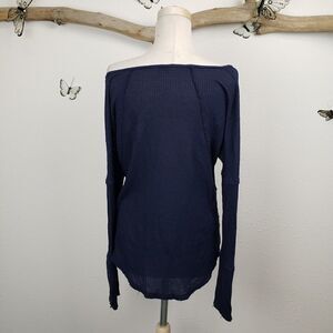 Off the shoulder waffle knit thermal. Scooped hem. Oversized fit with fitted sleeves and decorative buttons on cuff.