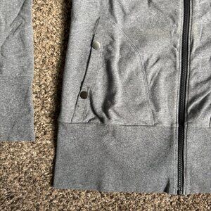 Full zip design with top and bottom zipper. Two front pockets with snap closures designed for functionality. Long sleeves with thumbholes at the cuffs. Super soft, thicker stretchy performance material. Suitable for active use or casual wear. Material is medium weight I would say.