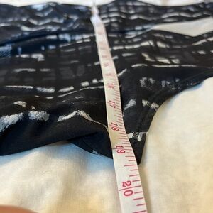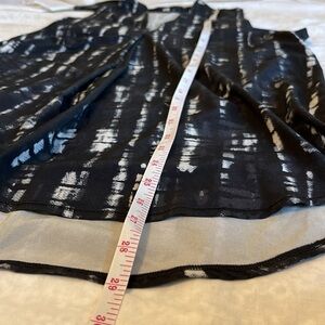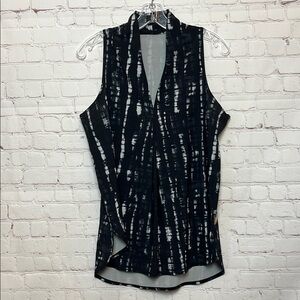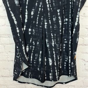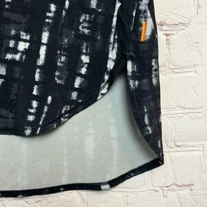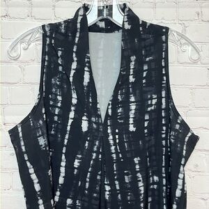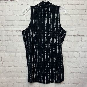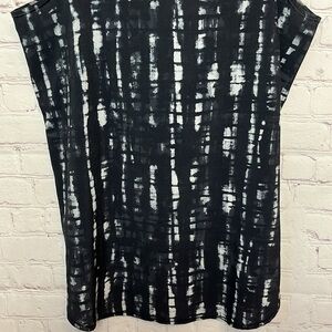 Flowy quick dry fabric in black and white tie dye like print. V neckline. Shirt tail hem. Longer length for better coverage. Sleeveless.
