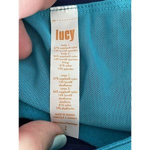 This is a super nice twist back tank top by Lucy. Gorgeous purple and blue color. The Lucy logo orange embroidery is shown on the back. This has a really nice built-in bra and is super soft. Made of 87% Supplex nylon and 13% Lycra spandex.