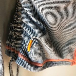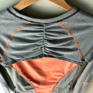 Gray and peach colored long-sleeve Lucy activewear workout top in excellent pre-owned condition - no known flaws. Features ruched sides that you can loosen or tie tighter. Back has large vented panel. Cute gathering above the panel. Crewneck and stitching detail throughout.
