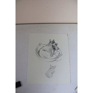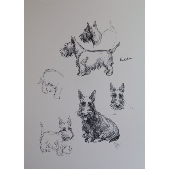This print was rescued from the 2016 reprint of the 1937 book of Dogs Rough and Smooth by Lucy Dawson. 2 sided both featuring Scotty dogs. Print is an open edition reproduction of what was probably originally a lithograph. Measures approximately 11 X 9 1/4 inches. In good condition - given the age. Wear to edges from use and a rough edge where pulled from book. Some darkening/yellowing from age.