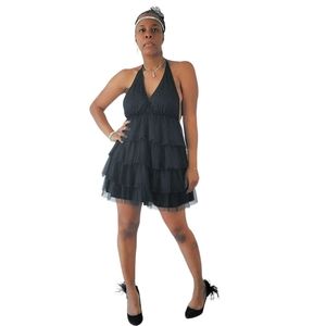 Lucy In The Sky Black Sukie Mesh Ruffled Mini Dress. Size XL. Ruffled tiered tulle mini dress with single vertical rhinestone back strap details, open back, adjustable strap at the back neckline, plunging front V-neck, sheer and mesh material, elastic waist & fulling lined.
