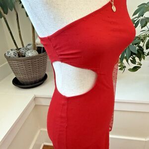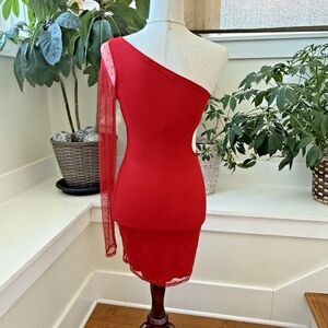 Lucy In The Sky Dress Small Red One Shoulder Mini Long Sheer Sleeve Cutouts