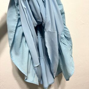 Light blue, sky blue, material with a ruffle skirt and scrunch top.