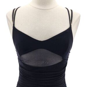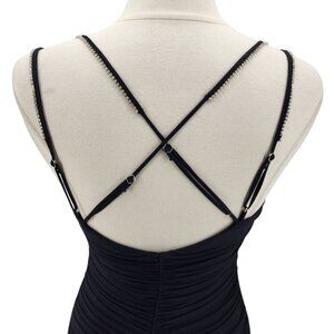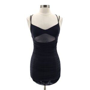 Pullover style fitted short sleeveless bodycon dress - mini dress. Body is made of a ruched black mesh fabric. Inner solid black lining with a cut out on the upper front. Adjustable straps with rhinestones attached. material is stretchy. 100% Polyester. Party, cocktail, evening wear, club, bachelorette, homecoming prom, dance, date night
