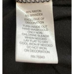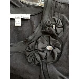 Lucy & Laurel black tank top - size Small - rayon spandex blend feels soft and stretchy. Scoop neck is embellished with fabric flowers and rhinestones. Neckline is delicate eyelash ribbon trim. In excellent pre-owned condition - no damage or flaws.