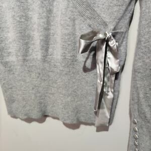 Lucy & Laurel grey faux wrap sweater with satin bow at the hip. V neckline, pullover style meant to look like a ballet wrap sweater. Satin covered buttons at the sleeves.