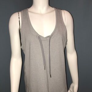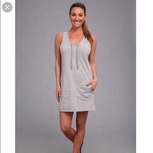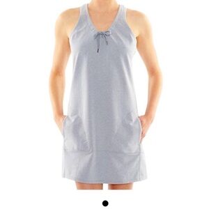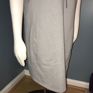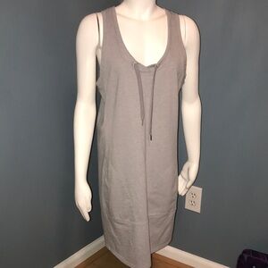 Casual sleeveless dress with front pocket and drawstring neck. Size medium. Gray