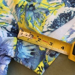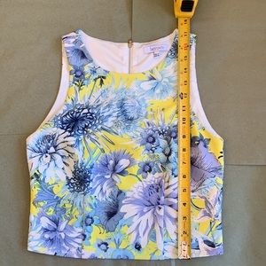 Lucy Paris trendy 2 piece matching tank and shorts set. So cute! Yellow and blue floral pattern. Structured, opaque fabric can be dressed up or down. Fabric has a kind of mini-waffle texture. Back zip for tank top and side zip for shorts. Super comfortable, chic, throw on and go complete outfit for vacation or spring.