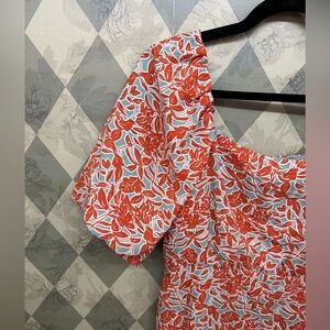 Keywords: Lucy Paris dress, floral mini dress, puff sleeve dress, orange summer dress, cocktail dress, garden party dress, vacation outfit, trendy mini dress, size small, feminine chic.