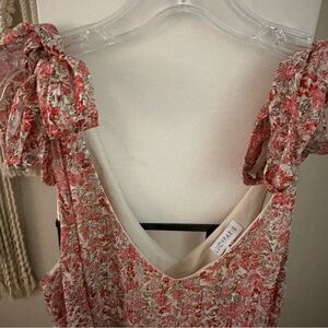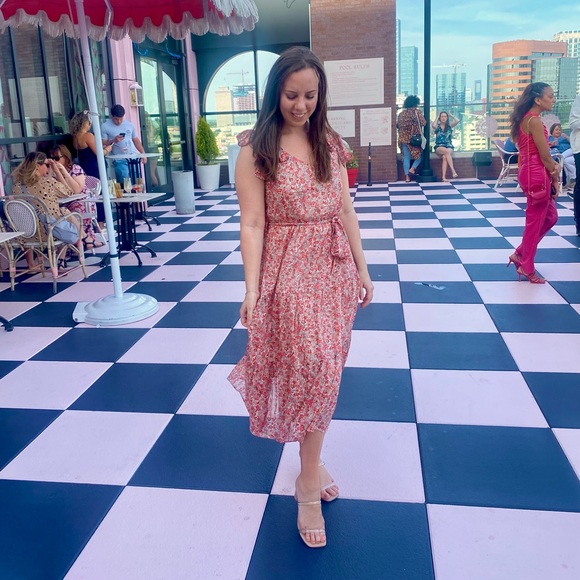 Pink floral dress with waist tie and adjustable straps. Sizing runs big. Perfect for brunches or bachelorette gatherings.