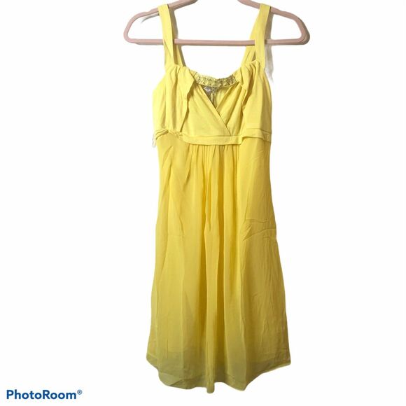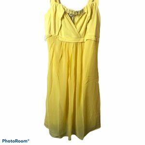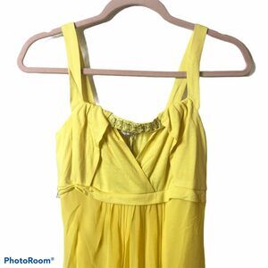 Yellow with beaded Cut-out front Mini dress. Thick spaghetti straps about 1" wide. Side zipper closure with lined interior and sheer overlay. Fitted upper and flowy bottom, stretchy upper backside. No stains or damage done. Removed from packaging for photos only.