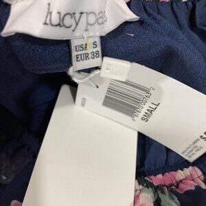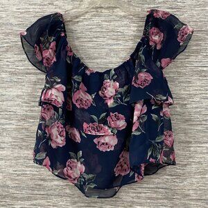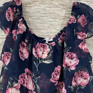 Lucy Pass Navy Floral Chiffon Ruffled Blouse With Pink Peony Print - Small NWT