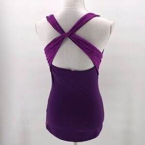 Purple tank with contrast fabric at neckline and straps from Lucy. Twisted criss cross straps for a flattering back. Built in bra. Gently used condition. Size small.