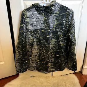Multi colored running jacket. Windbreaker material, great for working out. Great pockets. In amazing condition. Never been worn
