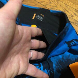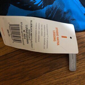 NWT, never-worn Lucy Studio Hatha Legging, Size M, Blue/Black abstract print. Wide waistband and front (off-center) internal waistband pocket, pictured. Compressive ("Powermax") -- 88% polyester, 12% spandex. From a pet-free, smoke-free home, and have also been kept in their original plastic packaging.