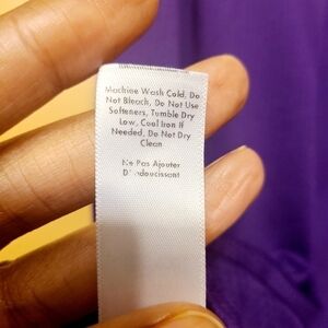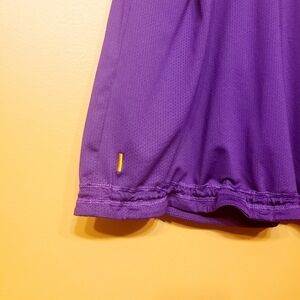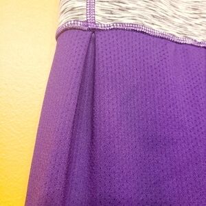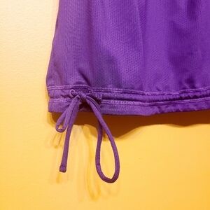 Women's purple color block, athletic, racerback tank top by Lucy Tech, size small. Polyester and spandex blend. Side ties and mesh material. Excellent pre-owned condition; no flaws.