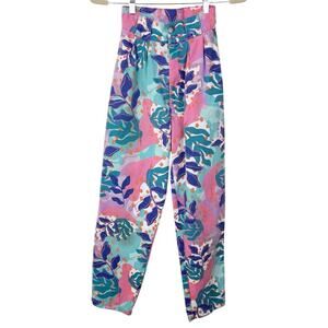 Pre-loved Lucy & Yak addison trousers. Featuring a limited edition, bold multicolor botanical print. Super high-waist with a thick sturdy waistband, roomy structured hips and a wide tapered leg. Side pockets, thick belt loops and made from thick, hardwearing 100% organic cotton twill. Photos show discoloration on front of right leg and there’s some wash wear (condition reflected in price).