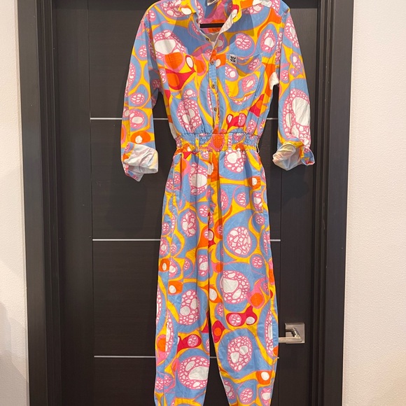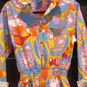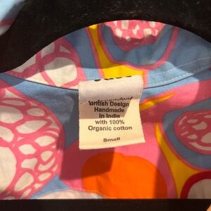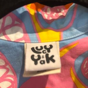 Vibrant Lucy & Yak design. Features abstract patterns in pink, blue, and yellow. Eye-catching and unique.