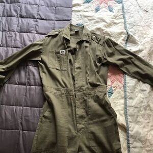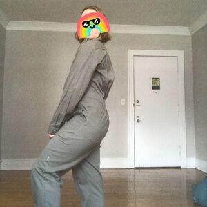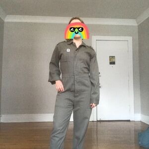 This is a khaki/army green color long sleeve jumpsuit from sustainable brand Lucy & Yak. It is a size Small but this brand usually has quite an oversize fit. For reference I am 5'2", 29 in waist, 36 bust, 39 at the widest part of my butt/hips and it's pretty cozy/loose on me. It is a bit long but the legs can be cuffed easily. Waist is elasticized in the back.