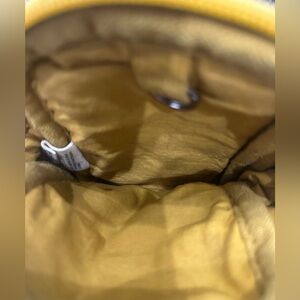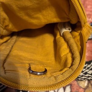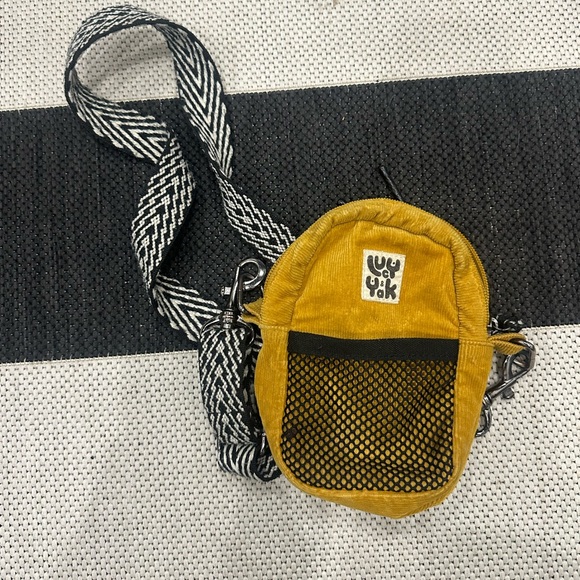 Stylish mustard crossbody bag. Features a mesh front pocket. Adjustable black and white strap. Perfect for everyday use.