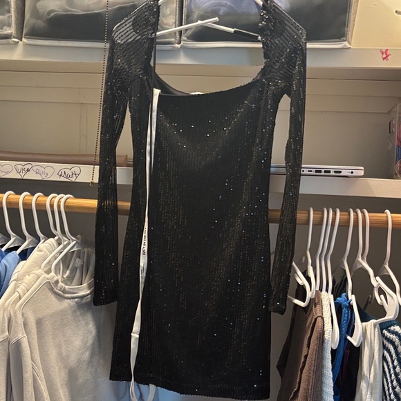 Dazzle in this black sequin dress. Long sleeves add elegance. Perfect for evening events. Perfect condition