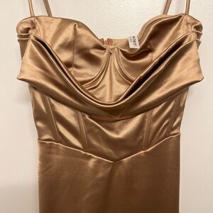 Gold satin evening dress, corset style. Size large but runs small. Brand new, never worn (no tags).