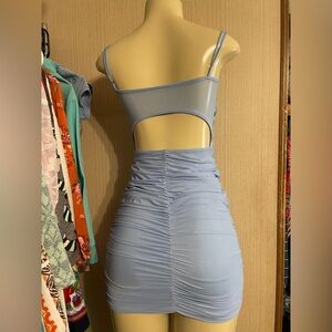 Chic light blue mini dress with ruched detailing. Perfect for a stylish look.
