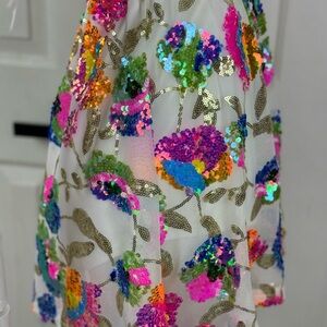 Elegant dress by Lucy in the Sky featuring vibrant sequin embellishments. Ideal for standout style. Dress in good condition.