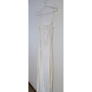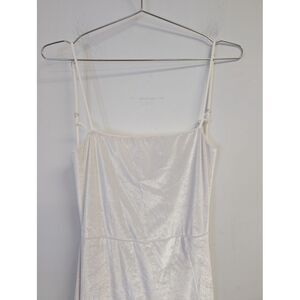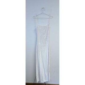 Elegant silver maxi dress. Features a sleek design with a high slit. Perfect for formal occasions.