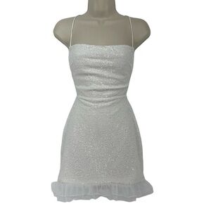 Elegant white mini dress. Features spaghetti straps and ruffle hem. Perfect for parties.