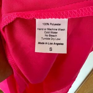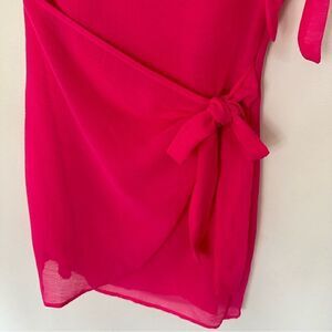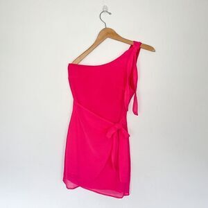 “This eye-catching one shoulder dress will make you the talk of the party! Made in our hot pink chiffon fabric, that is fun and timeless. Features a trendy one shoulder tie, frontal wrap feature and a side tie for the perfect fit. Perfect for a day of shopping, day party or a fun night out! Dress up or down to fit the occasion.”