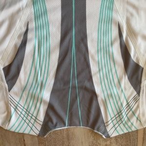 Reflective detail on front, but the grey, aqua and white graphic on the back sets this shirt apart from the rest!