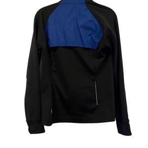 Blue and black with down puff front. Front pockets and thumb slits. No flaws. Spandex and polyester