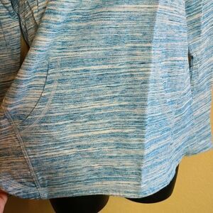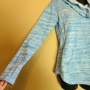 This is a light blue sweatshirt by Lucy. It is lightweight and has a cowl neckline. On the front is a kangaroo pocket.
