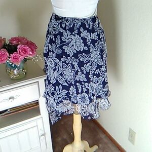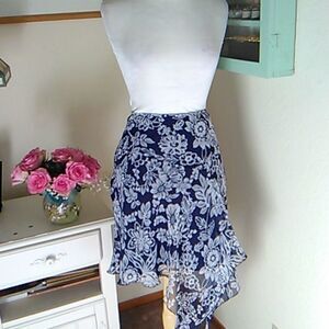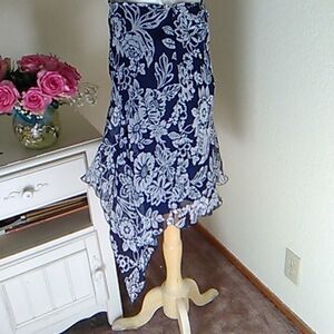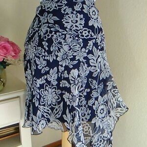Sheer floral handkerchief overlay over a solid navy lining. Side zip. Size 8 measures 32 at waist, 42 at hips. Hem 24-32 long . Beautiful and floaty. Like NEW.