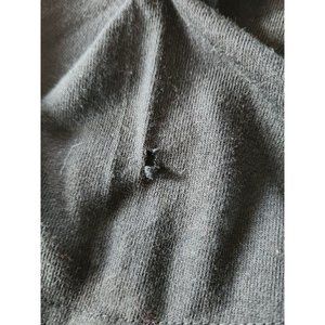 On the side of the shirt near the bottom there is a small hole. There is also a loose string near the bottom hem. *SEE PICTURES*