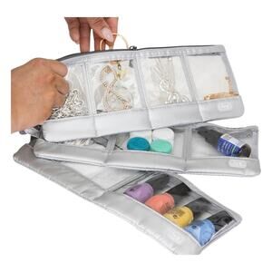 A harmonious blend of clarity and sophistication, these pouches showcase versatility and style. Designed with three envelopes with differing-sized zipper enclosures, you can carry just one or all three together. Ideal for organizing essentials, their transparent design combines elegance with practicality.
