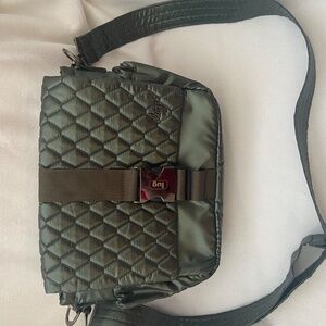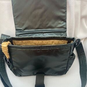 Step in to fall style with this gorgeous Lug "Harness" Crossbody/shoulder bag in Metallic Olive. It has a large metal clip closure, soft lined slip pocket with magnetic closure, two side guessed cargo pockets with magnetic closure, removable crossbody strap, inside you have one clear view zipper pocket, two cargo pockets and a bungee keychain. 11.5"w x 8"h x 3.75"d, weights 0.8 lb, strap length: 28.5" to 55". Trim/lining 100% polyester. From a pet-free/smoke-free home.