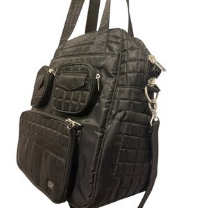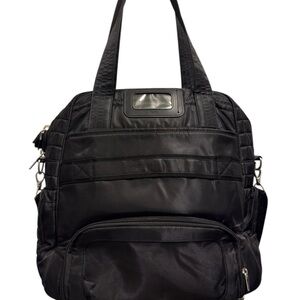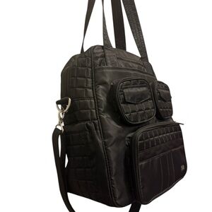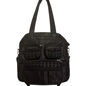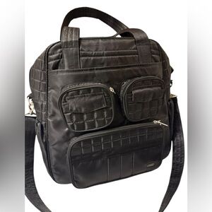 Lug Stylish and versatile black quilted bag perfect for everyday use. Lug Overnight Travel Gym Tote Puddle Jumper in Quilted Black with Long Strap. Several interior and exterior pockets, some zip or magnetic (see pictures). Also has a zipper shoe compartment and enforced bottom. Excellent preowned condition, like new!