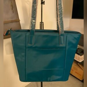 Padded tote handles, trolley sleeve, main zipper compartment, metal bottom feet, soft lined slip pocket with magnetic closure, extra D rings to convert to crossbody bag
