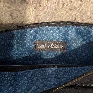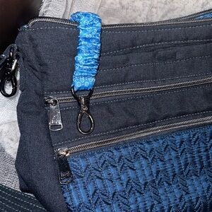Elegant blue bag with quilted pattern. Features a sleek design and brand logo. Many pockets inside and out. Adjustable shoulder strap that also can be removed. Pre-owned in like new condition.